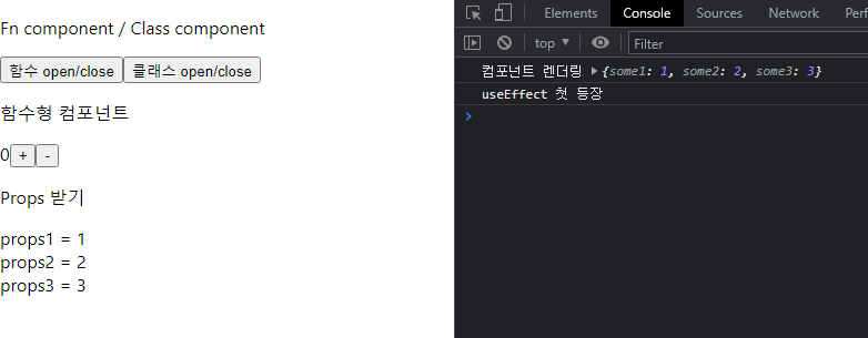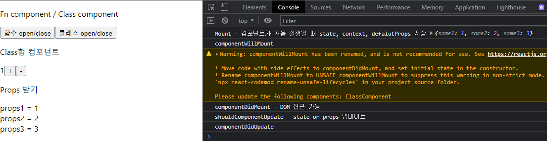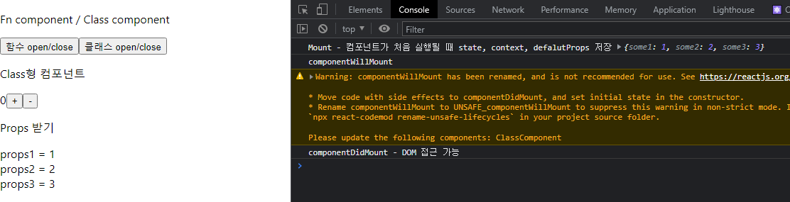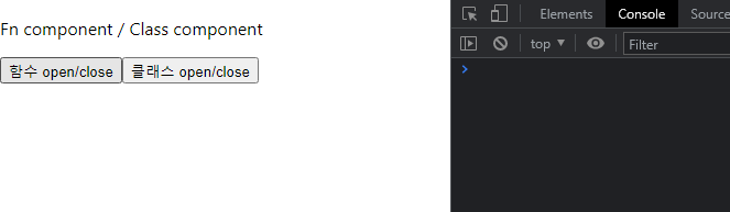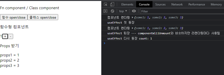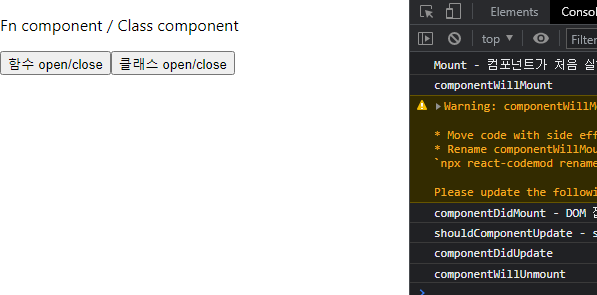 위와 같이 컴포넌트를 여닫는 페이지가 있다고 가정했을 때, console을 통해 대략적인 흐름을 확인해 볼 수 있다.