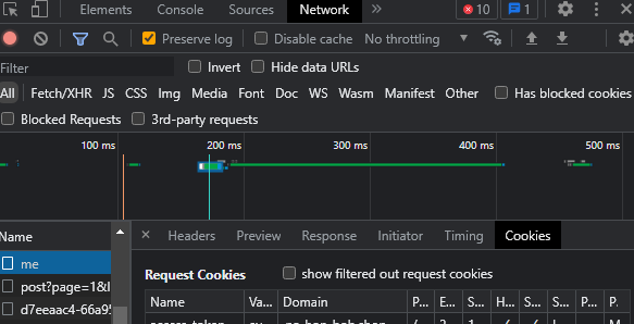 cors 설정도 credential: true나 origin 등을 정상적으로 해놓은 상태이기 때문에 쿠키 외 다른 데이터는 정상적으로 받아오는걸 확인할 수 있었다.